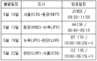 다음은 홍비서가 알아본 상사의 항공일정이다. 항공일정에 따른 홍비서가 상사에게 보고하는 내용이 올바르지 않은 것은?