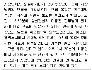 사장님은 아침 일찍 업무를 마무리한 후 우리 회사를 방문한 Mary&Young 의 마케팅상무님과 영업점 방문을 나가셨다. 사장님 외출 후 일어난 아래의 내용을 사장님께 휴대전화로 보고 하려고 한다. 다음 내용을 휴대전화 문자를 통해 보고할 때 가장 적절한 것은?