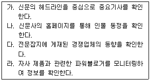 상사에게 필요한 내 ·외부의 정보를 적시에 제공하기 위해 강비서는 다양한 경로를 통해서 정보를 수집하고 있다. 강비서의 정보 수집 방법으로 적절하지 않은 것끼리 묶인 것은?
