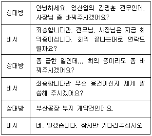 다음 전화대화를 읽고 비서의 전화업무 태도에 관한 가장 부적절한 설명을 보기에서 고르시오.