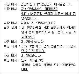 다음은 직급이 다른 두 임원의 전화연결 대화이다. 비서의 전화응대 화법으로 가장 적절하지 않은 것은?