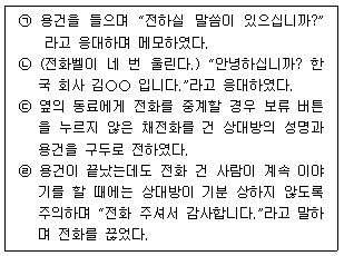 다음은 김 비서의 전화응대 상황을 나타낸 것이다. 적절하지 않은 것끼리 짝지어진 것은?