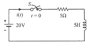 그림의 회로에서 t=0s에 스위치(S)를 닫은 후 t=1s일 때 이 회로에 흐르는 전류는 약 몇 A인가?