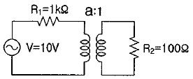 그림과 같은 변압기 회로에서 부하 R2에 공급되는 전력이 최대로 되는 변압기의 권수비 a는?
