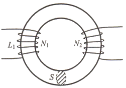 그림과 같이 단면적 S(m2)가 균일한 환상철심에 권수 N1인 A 코일과 권수 N2인 B 코일이 있을 때, A코일의 자기 인덕턴스가 L1(H)이라면 두 코일의 상호 인덕턴스 M(H)는? (단, 누설자속은 0이다.)