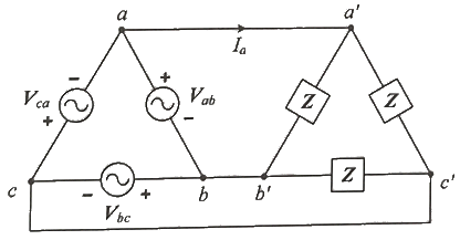 그림과 같은 평형 3상회로에서 전원 전압이 Vab=200(V)이고 부하 한상의 임피던스가 Z=4+j3(Ω)인 경우 전원과 부하사이 선전류 Ia는 약 몇 A인가?
