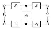 그림과 같은 H형 4단자 회로망에서 4단자 정수(전송파라미터) A는? (단, V1은 입력전압이고, V2는 출력전압이고, A는 출력 개방 시 회로망의 전압 이득