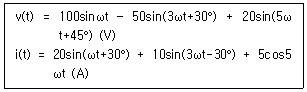 전압 및 전류가 다음과 같을 때 유효전력[W] 및 역률[%]은 각각 약 얼마인가?