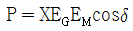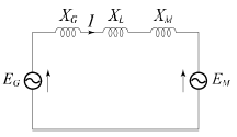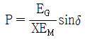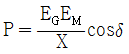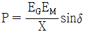 그림과 같은 2기 계통에 있어서 발전기에서 전동기로 전달되는 전력 P는? (단, X=XG+XL+XM 이고 EG, EM은 각각 발전기및 전동기의 유기기전력, δ는 EG와 EM간의 상차각이다.)