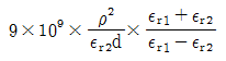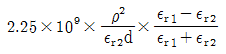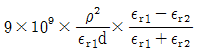 비유전율 Єr1, Єr2인 두 유전체가 나란히 무한평면으로 접하고 있고, 이 경계면에 평행으로 유전체의 비유전율 Єr1 내에 경계면으로부터 d[m]인 위치에 선전하 밀도 ρ[C/m]인 선상전하가 있을 때, 이 선전하와 유전체 Єr2간의 단위 길이당의 작용력은 몇 N/m인가?