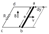 자속밀도 B(Wb/m2)의 평등 자계 내에서 길이 ℓ(m) 인 도체 ab가 속도 v(m/s)로 그림과 같이 도선을 따라서 자계와 수직으로 이동할 때, 도체 ab에 의해 유기된 기전력의 크기 e(V)와 폐회로 abcd 내 저항 R에 흐르는 전류의 방향은? (단, 폐회로 abcd 내 도선 및 도체의 저항은 무시한다.)