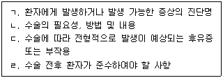 「의료법」상 사람의 생명 또는 신체에 중대한 위해를 발생하게 할 우려가 있는 수술을 하는 경우 환자에게 설명하고 동의를 받아야 하는 사항만을 모두 고르면?