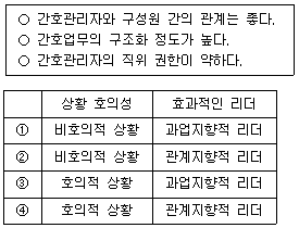 피들러(Fiedler)의 상황적합성 이론에 근거할 때, 다음 설명에서 상황 호의성과 효과적인 리더를 바르게 연결한 것은?