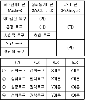 다음 표는 동기부여 이론 간 유사한 욕구나 관점을 비교한 것이다. (가)~(라)에 들어갈 말로 옳은 것은?