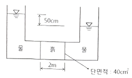 그림에서 흙의 단면적이 40cm2이고 투수계수가 0.1cm/s 일 때 흙 속을 통과하는 유량은?
