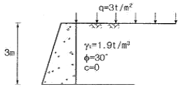 그림과 같이 옹벽 배변의 지표면에 등분포 하중이 작용할 때, 옹벽에 작용하는 전체 주 동토압의 합력(Pa)과 옹벽 저면으로부터 합력의 작용점까지의 높이(h)는?