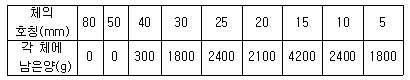 전체 15㎏의 굵은 골재로 체가름 시험을 한 결과가 아래의 표와 같을 때 조립률은?