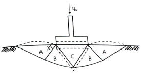 그림은 확대 기초를 설치했을 때 지반의 전단 파괴형상을 가정(Terzaghi의 가정)한 것이다. 다음 설명 중 틀린 것은? (단, ø은 내부마찰각이다.)