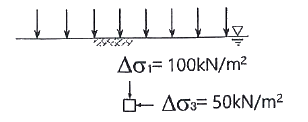 그림과 같은 지반에서 하중으로 인하여 수직응력(△σ1)이 100 kN/m2 증가되고 수평응력(△σ3)이 50 kN/m2 증가되었다면 간극수압은 얼마나 증가되었는가? (단, 간극수압계수 A = 0.5 이고, B = 1 이다.)