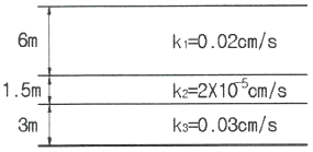 아래 그림과 같이 3개의 지층으로 이루어진 지반에서 수직방향으로 등가투수계수는?