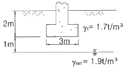 아래 그림과 같은 3m×3m 크기의 정사각형 기초의 극한지지력을 Terzaghi 공식으로 구하면? (단, 내부마찰각(ø)은 20°, 점착력(c)은 5t/m2, 지지력계수 Nc=18, Nγ=5, Nq=7.5 이다.)
