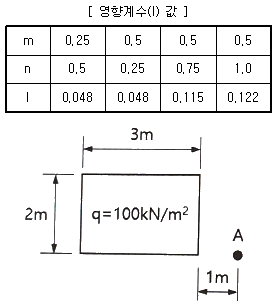 그림과 같이 폭이 2m, 길이가 3m인 기초에 100kN/m2의 등분포 하중이 작용할 때, A점 아래 4m 깊이에서의 연직응력 증가량은? (단, 아래 표의 영향계수 값을 활용하여 구하며, m=B/z, n=L/z이고, B는 직사각형 단면의 폭, L은 직사각형 단면의 길이, z는 토층의 깊이이다.)