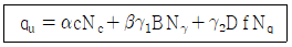 얕은 기초에 대한 Terzaghi의 수정지지력 공식은 아래의 표와 같다. 4m×5m의 직사각형 기초를 사용할 경우 형상계수 α와 β의 값으로 옳은 것은?
