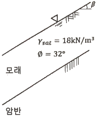 그림과 같이 c=0인 모래로 이루어진 무한사면이 안정을 유지(안전율≥1)하기 위한 경사각(β)의 크기로 옳은 것은? (단, 물의 단위중량은 9.81kN/m3이다.)