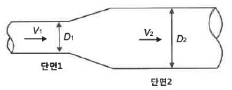 그림과 같은 원형관에 물이 가득차서 흐르고 있다. 단면1에서 직경 D1 = 30cm, 유속 V1 = 3.0m/s, 단면2에서 직경 D2 = 50cm 일 때, 단면2의 유속(m/s)과 유량(m3/s)은 각각 얼마인가? (단, 흐름은 정상류이며, 손실은 무시한다.)