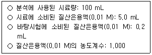 먹는물수질공정시험기준상 염소이온을 질산은적정법으로 분석한 결과가 다음과 같을 때, 염소이온 농도(mg/L)는?
