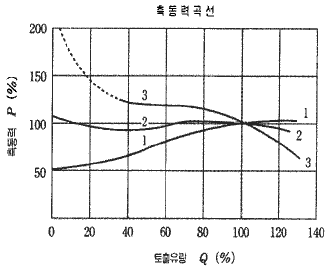 다음 그림은 펌프형식에 따른 축동력곡선이다. 곡선 3이 표시하는 펌프의 형식은?