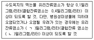 수도법령상 일반수도사업자가 하여야 하는 위생상의 조치에서 수도꼭지에서의 먹는 물의 잔류염소 농도의 규정에 관한 설명이다. ( )에 들어갈 내용으로 옳은 것은?