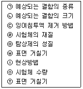 다음은 침투탐상검사에서 탐상을 하기 전에 고려해야 할 사항을 나열한 것이다. 시험 방법의 선정에 고려해야 할 사항만을 모두 나열한 것은?
