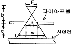보일러 및 압력용기에 대한 방사선투과검사(ASME Sec, V Art. 2)에 따른 이동 방사선투과검사 시 이동방향에서 측정된 용접부 선원 쪽에서의 빔폭(W)은? (단, F : 3mm, a : 60mm, b : 120mm, C : 100mm)