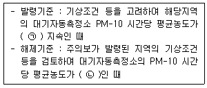 다음은 대기환경보전법규상 미세먼지(PM-10)의 “주의보” 발령기준 및 해제기준이다. ( )안에 알맞은 것은?