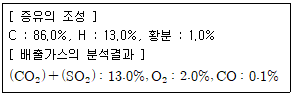 중유를 시간당 1000kg씩 연소시키는 배출시설이 있다. 연돌의 단면적이 3m2 일 때 배출가스의 유속(m/s)은? (단, 이 중유의 표준상태에서의 원소 조성 및 배출가스의 분석치는 아래 표와 같고, 배출가스의 온도는 270℃이다.)