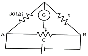 다음 그림과 같이 AB의 저항이 균일한 도선에서 검류계의 한 단자가 AC : CB = 3 : 2 되는 점 C에 접촉되었을 때, 검류계의 눈금이 0을 가리켰다면 X의 저항 값은?