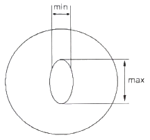 표준직경 50[μm]의 광섬유케이블에서 광심선 코어가 다음 그림과 같이 찌그러져 최대직경 max가 51.7[μm]이고 최소직경 min가 48.8[μm]이라면 이 광섬유 코어의 비원율은 몇 [%] 인가?