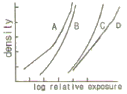 그림은 X선 필름의 특성을 나타낸 필름특성곡선이다. 다음 중 가장 노출시간이 짧은 필름은?