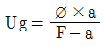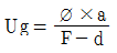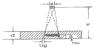 그림에서 초점의 직격을 ø, 초점과 필름사이 거리를 F, 결함과 필름 사이 거리를 a, 시험체의 두께를 d라 하면 기하학적 불선명도(Ug)의 계산식으로 옳은 것은?