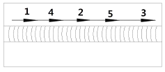 용접에 의한 변형을 작게 하기 위하여 주로 박판용접에 적합한 아래 그림과 같은 용착법은?