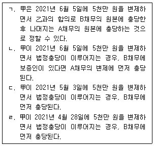 甲은 乙에 대하여 A채무(원본: 5천만 원, 대여일: 2021년 3월 1일, 이자: 월 0.5 %, 변제기: 2021년 4월 30일)와 B채무(원본: 4천만 원, 대여일: 2021년 4월 1일, 이자: 월 1 %, 변제기: 2021년 5월 31일)를 부담하고 있다. 이에 관한 설명으로 옳은 것을 모두 고른 것은? (다툼이 있으면 판례에 따름)