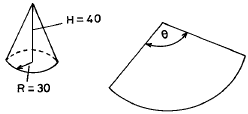그림과 같은 원추를 계산식으로 전개하면 전개도에서 θ는 몇도가 되는가? (단, 원추의 반지름 R = 30mm,높이 H = 40mm)
