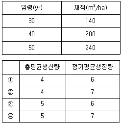 다음은 소나무림의 재적조사 내용이다. 임령 40년에서의 ha당 총 평균생장량[m3/ha/yr]과 10년 간(임령 30~40년)의 정기평균생장량[m3/ha/yr]을 바르게 연결한 것은?