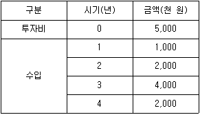 다음과 같이 현금흐름이 발생하는 사업이 있을 때, 회수기간법을 이용하여 계산한 회수기간[년]은? (단, 모든 현금흐름은 균등하게 발생한다)