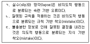 라스무센(Rasmussen)의 SRK 모델을 근거로 리전(J. Reason)이 제안한 인적오류 분류에 관한 내용으로 옳은 것을 모두 고른 것은?