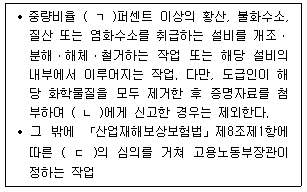 산업안전보건법령상 도급승인 대상 작업에 관한 것으로 “급성 독성, 피부부식성 등이 있는 물질의 취급 등 대통령령으로 정하는 작업”에 관한 내용이다. ( )에 들어갈 내용을 순서대로 옳게 나열한 것은?