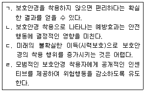 용접공이 작업 중에 보호안경을 쓰지 않으면 시력손상을 입는 산업재해가 발생한다. 용접공의 행동특성을 ABC행동이론(선행사건, 행동, 결과)에 근거하여 기술한 내용으로 옳은 것을 모두 고른 것은?(문제 오류로 확정 답안 발표시 모두 정답처리 되었습니다. 여기서는 임의로 1번을 누르면 정답 처리 됩니다.)