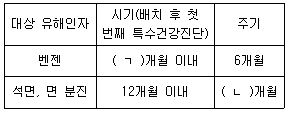 특수건강진단의 시기 및 주기에 관한 산업안전보건법 시행규칙 [별표 23]의 일부이다. ( )에 들어갈 숫자로 옳은 것은? (단, 특수건강진단 주기의 예외 규정은 고려하지 않음)