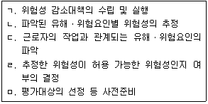 위험성평가(risk assessment)를 실시하는 절차를 순서대로 옳게 나열한 것은?